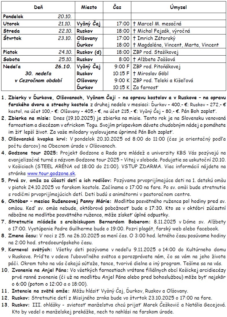 Liturgický prehľad a oznamy 20. - 26.10.2025