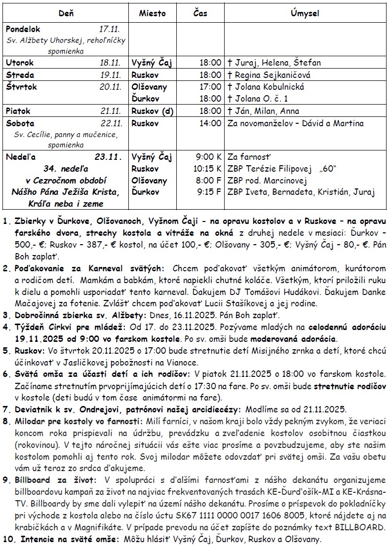 Liturgický prehľad a oznamy 17. - 23.11.2025