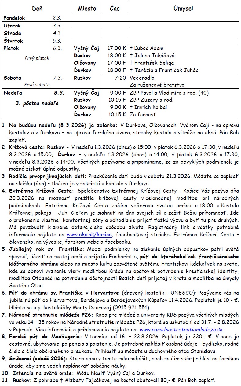 Liturgický prehľad a oznamy 02. - 08.03.2026