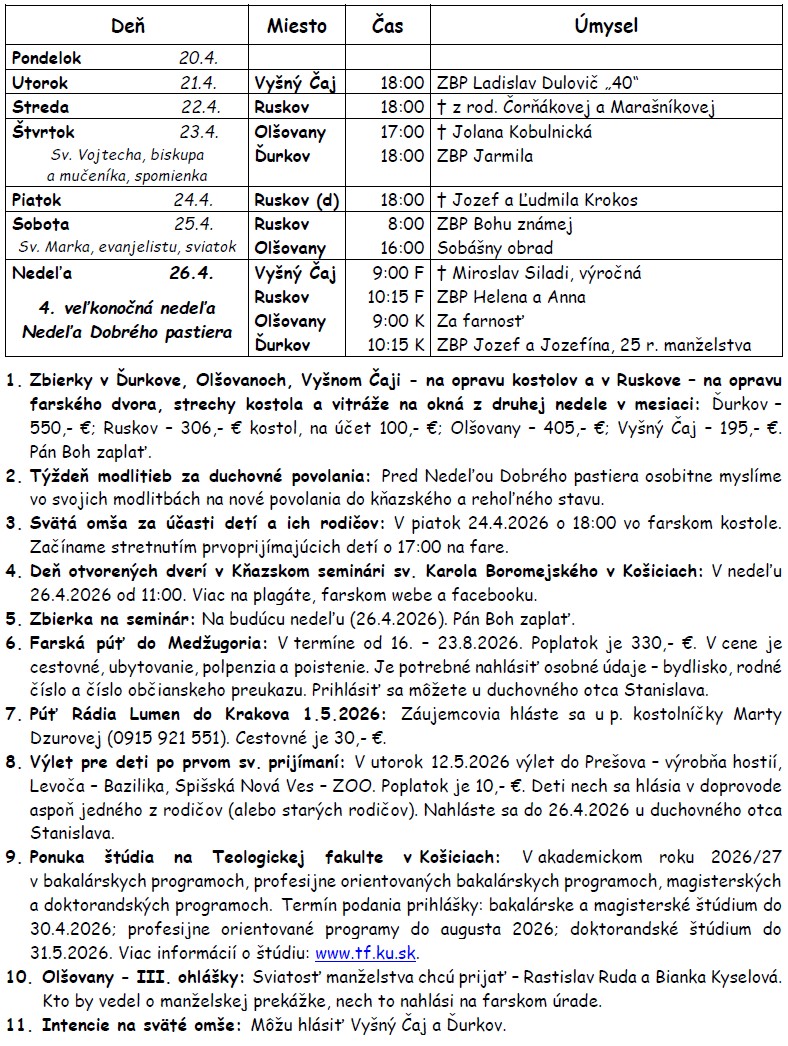 Liturgický prehľad a oznamy 20. - 26.04.2026