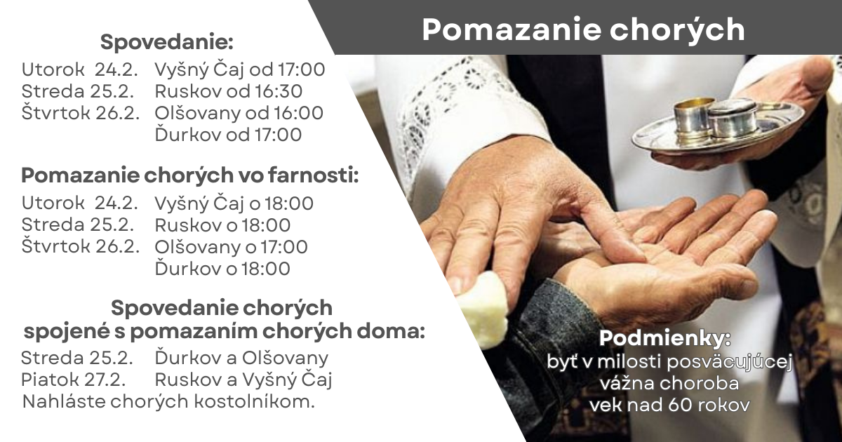 „Je niekto z vás chorý? Nech si zavolá starších Cirkvi; a nech sa nad ním modlia a mažú ho olejom v Pánovom mene. Modlitba s vierou uzdraví chorého a Pán mu uľaví; a ak sa dopustil hriechov, odpustia sa mu“ (Jak 5,14-15).
